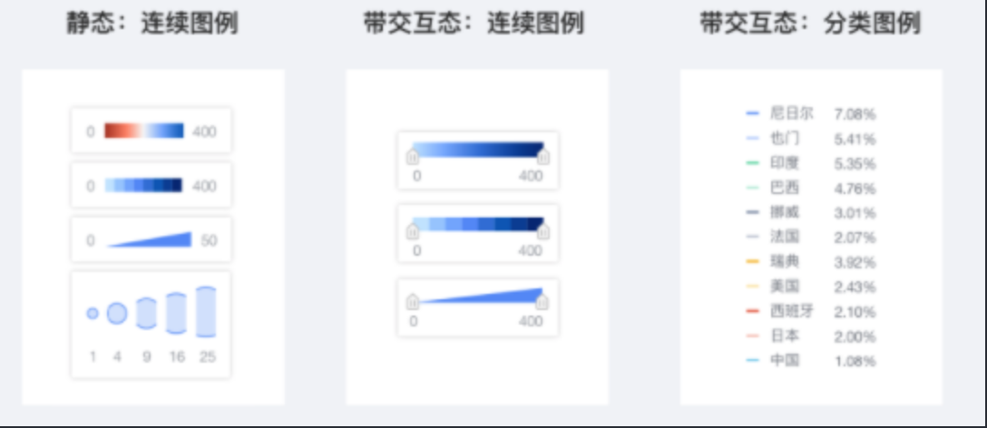 当然图例不仅仅是静态的,还可以带有交互态,在实际运用中,用户可以点击图例进行对地图数据进行筛选渲染。在一些常见的图表库便可以看到。