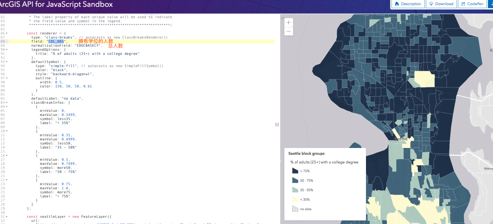 举个例子,下图是 arcgis 的一个在线地图服务,services.arcgis.com/V6ZHFr6zdgN… COL_DEG 属性字段,得出西雅图各个街区的拥有大学学位的成年人数,可以点击这里。