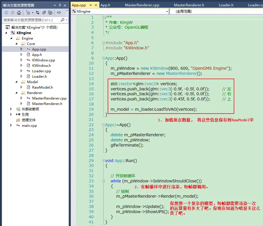 图形程序也是程序,它只有渲染的那部分是借助GPU完成的, 而关于逻辑运算,比如:加载游戏数据,处理游戏中玩家的输入,游戏逻辑等这些操作还是在GPU上运行的。游戏数据包括游戏需要显示的数据,比如:游戏人物的网格数据,怪物的网格数据等;还有就是玩家数据,比如得分、等级等。前者需要从本地磁盘读取,加载到内存中,需要显示的时候,才调用相关的OpenGL命令将数据从内存中发送到GPU的显存。大家都知道,既然这些数据需要在显卡上做计算,那么当然GPU从显存中拿数据比从内存中拿数据要快得多。OpenGL就提供了管理显存中需要渲染数据的对象VAO和VBO。