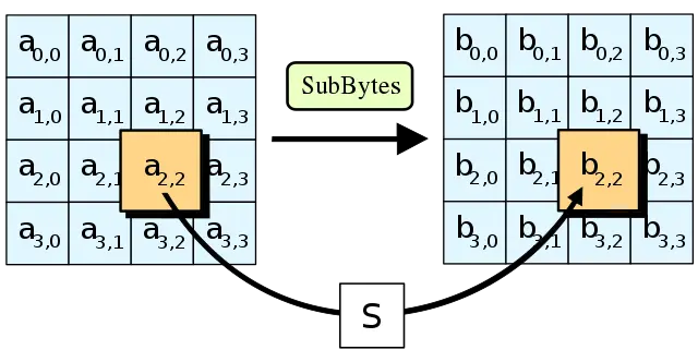 - 透过一个非线性的替换函数,用查找表的方式把每个字节替换成对应的字节。