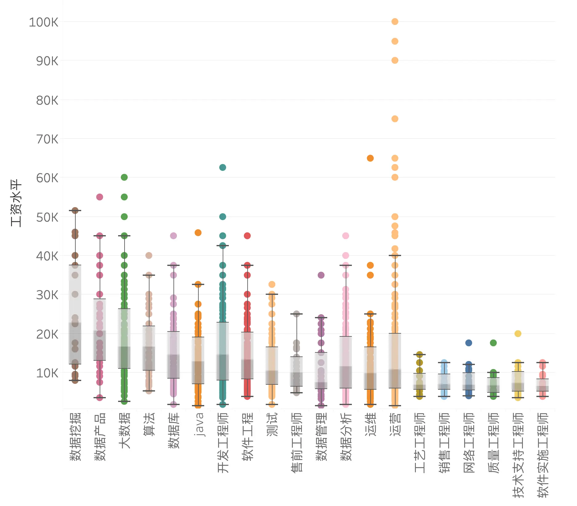 上图分析了各行业工资的分布状况,最明显的顶端我们可以看到教育,影视和美容,可以给大家做一个参考。当然有时候在一个自己喜欢的行业工作远超于自己对工资的期待,选择的时候着重关注每个城市的行业特色。