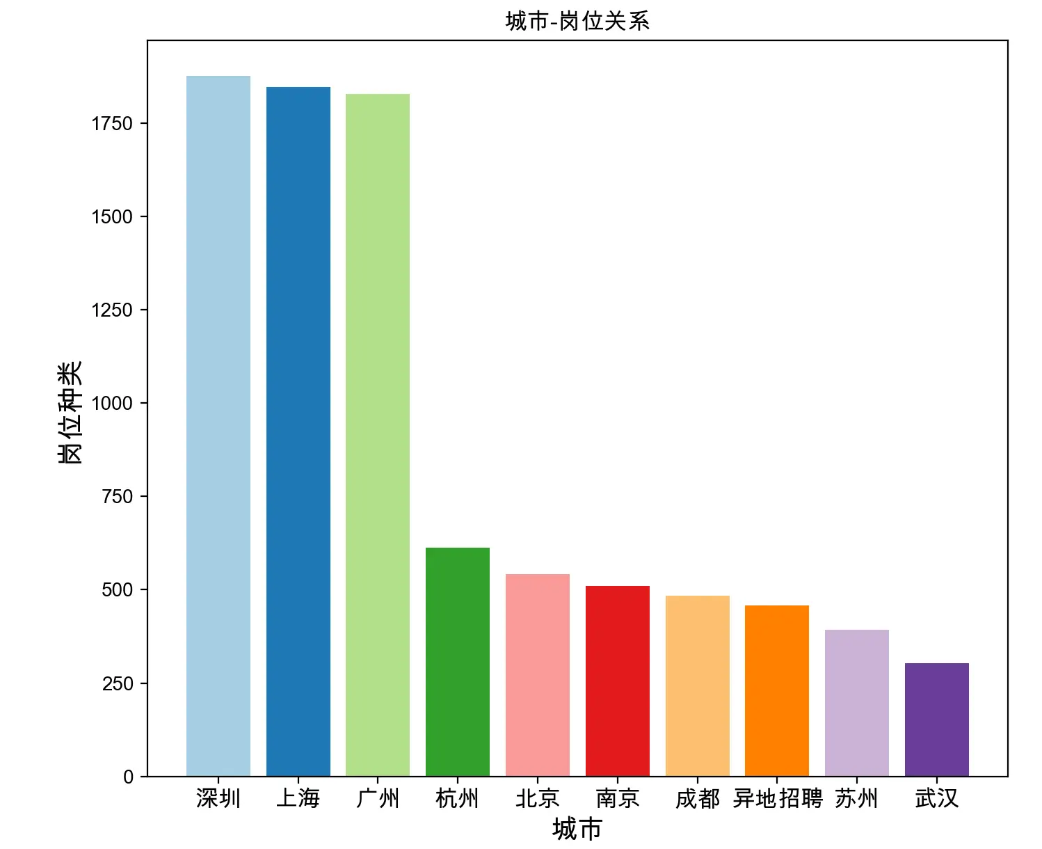 其中最重要的两个要素还是这个城市招聘的岗位多不多,决定能不能找到工作;这个城市的工资水平怎么样,决定能生活水平怎么样,这里通过这两个维度进行画图分析,圈圈越大表示这个城市招聘的岗位最多,颜色表示这个城市的平均工资越高。