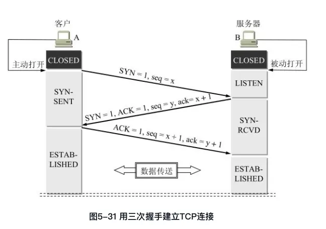 1. A主动打开连接,向B发送SYN = 1, seq = x。