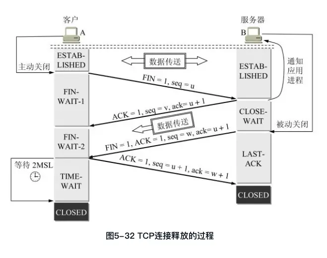 1. A先向其TCP发出连接释放报文段,并停止发送数据,主动关闭TCP连接。