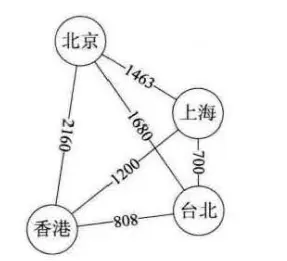 这种带权的图通常称为网。如下图就是一张带权的图,即标识中国四大城市的直线距离的网,此图中的权就是两地的距离。
