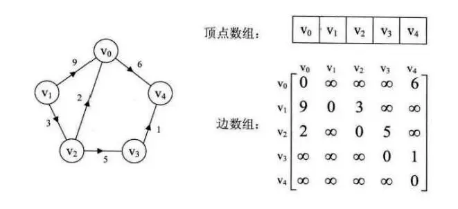 我们知道,每条边上带有权值的图叫做网,那么在存储的时候,可以采用权值代替矩阵中的0、1,权值不存在的元素之间用∞表示,如下图,左图是一个有向网图,右图就是它的邻接矩阵。