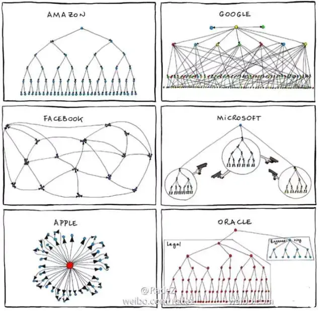 中文直译大概的意思就是:设计系统的组织,其产生的设计等同于组织之内、组织之间的沟通结构。看看下面的图片(来源于互联网,侵删),再想想Apple的产品、微软的产品设计,就能形象生动的理解这句话。