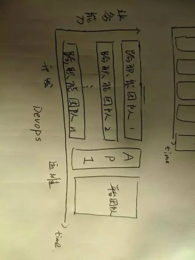 使用了微服务架构体系,团队组织方式需要转变成跨职能团队,即每个团队都有产品专家,策划专家,开发专家,运维专家,他们使用API方式发布他们的功能,而平台使用他们的功能发布产品