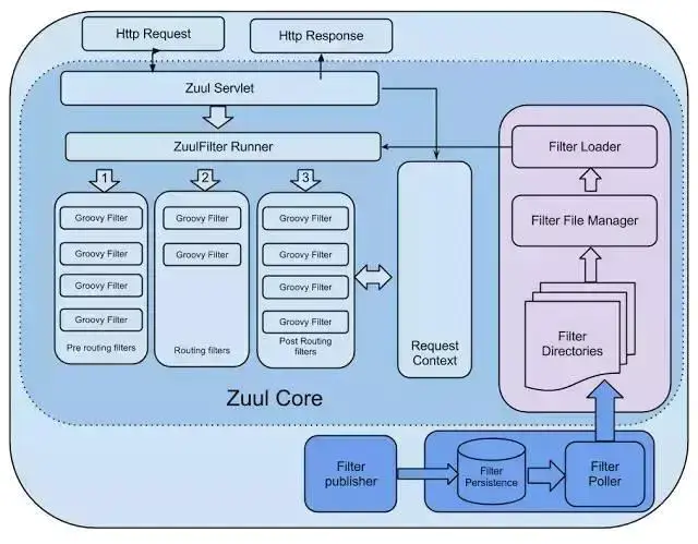 先说说架构图左半部分,分别是使用Groovy实现的前置路由过滤器,路由过滤器,后置路由过滤器。
