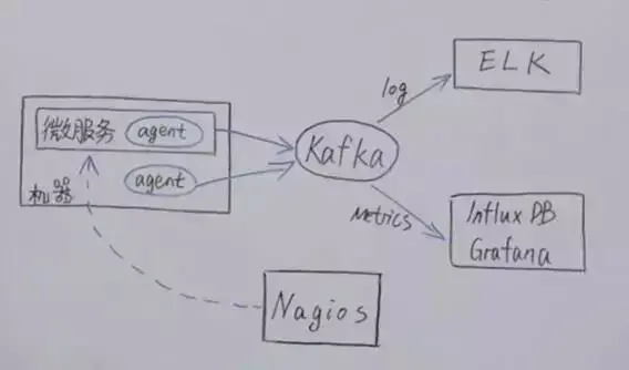 下面的图是大部分公司的一种监控架构图。每一个服务都有一个agent,agent收集到关键信息,会传到一些MQ中,为了解耦。同时将日志传入ELK,将Metrics传入InfluxDB时间序列库。而像nagios,可以定期向agent发起信息检查微服务。