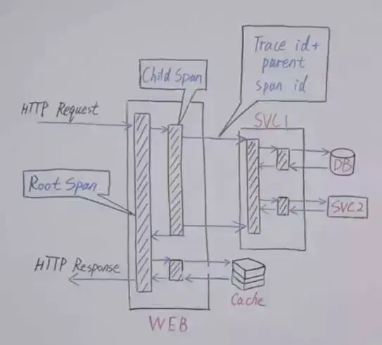 当请求进入Web容器的时候,会经过创建Tracer,连接spans(模拟潜在的分布式工作的延迟,该模块还包含在系统网络间传递跟踪上下文信息的工具包,如通过http headers)。Spans有一个上下文,其中包含tracer标识符,将其放在表示分布式操作的树的正确位置。当我们把图中的各种span放到后端的时候,我们的服务调用链会动态的生成调用链。