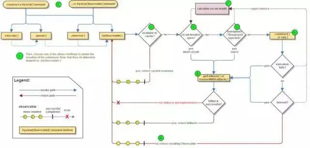 每一个微服务调用时,都会使用hystrix的command方式(上图的左上角那个),然后使用command同步的,或者是响应式的,或者是异步的,判断电路是否熔断(顺着图从左往右看),