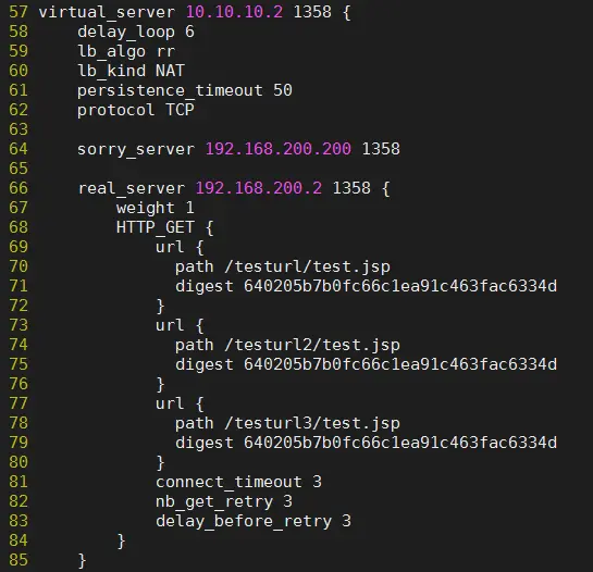 1)virtual_server:定义一个虚拟服务器,这个ip是virtual_address中定义的其中一个。语法格式:ip+空格+服务端口