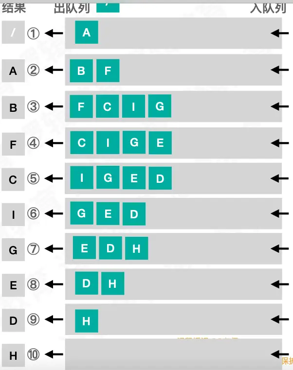 思路: 先把 图 旋转,看成树 1.把根节点放到队列的末尾 2.每次从队列的头部取出一个元素,检测这个元素是否有下一级,有则全部放到队尾 3.找到所有要找的元素是结束程序 4.如果遍历整个树还没有找到,结束程序。