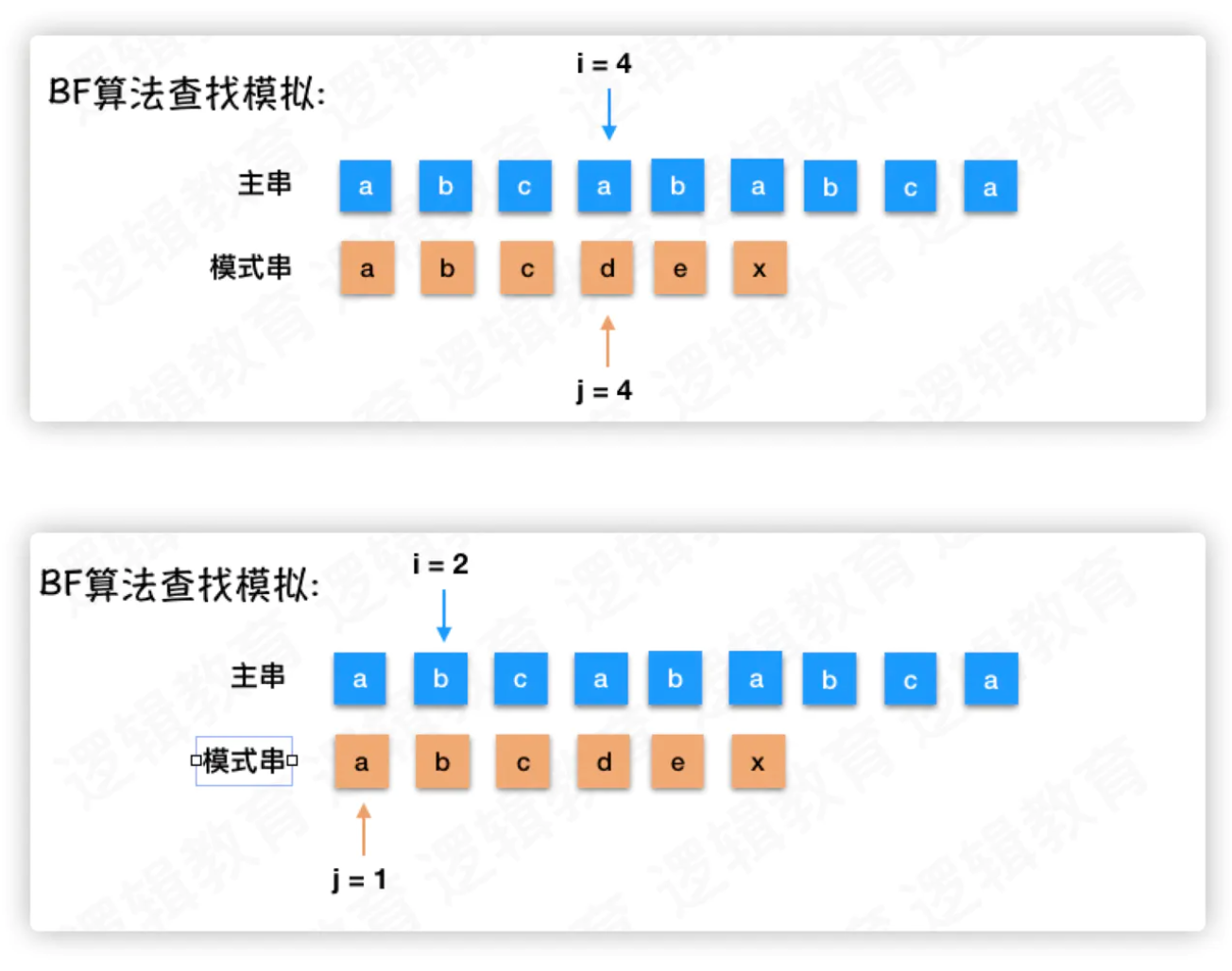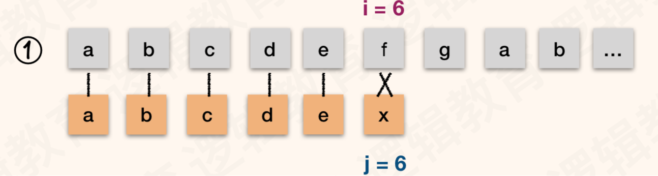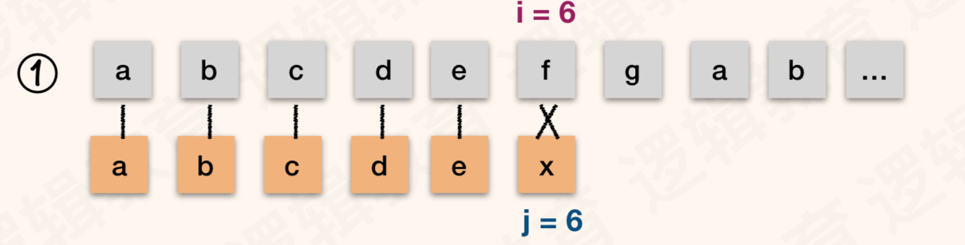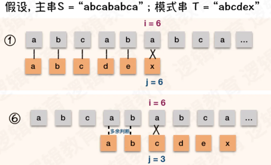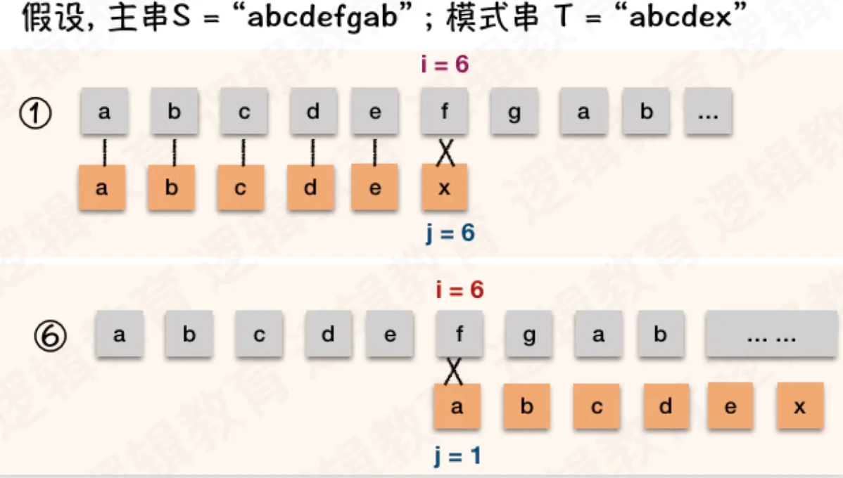 - 对比这2个例子中, 我们会发现 ① 时,我们的 i 值,就是主串当前位置的下是 6 ;