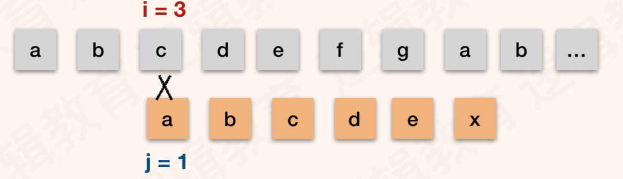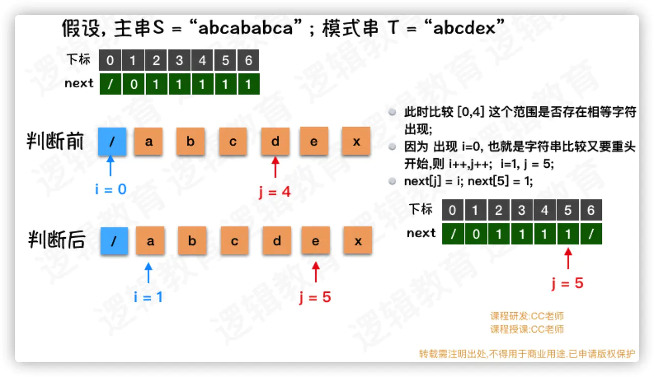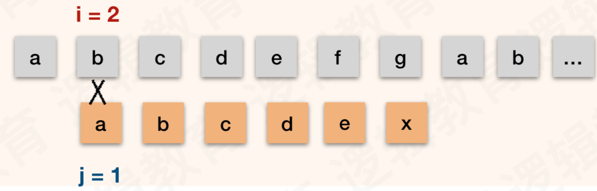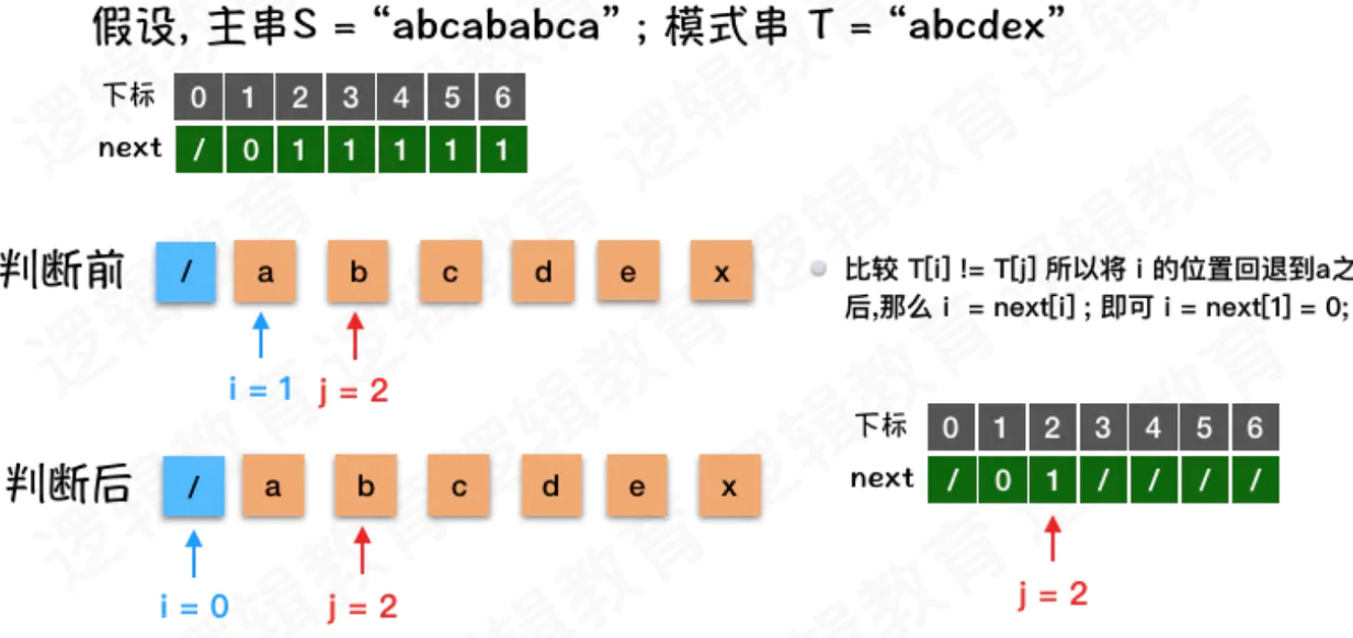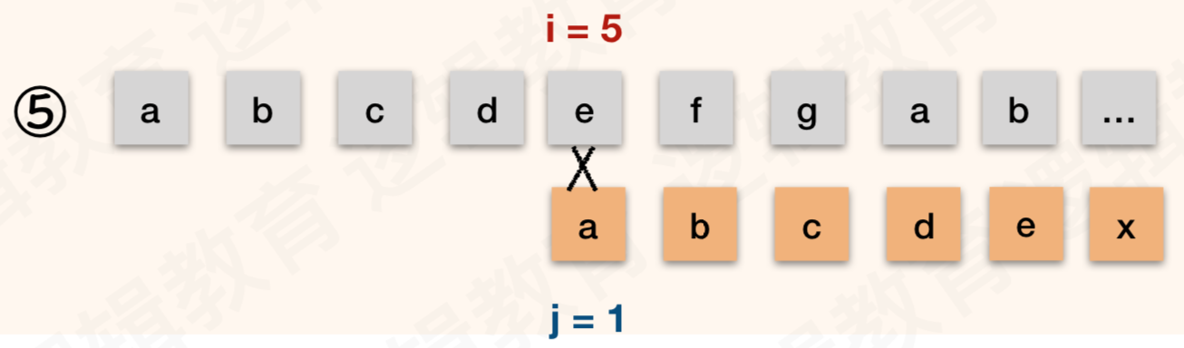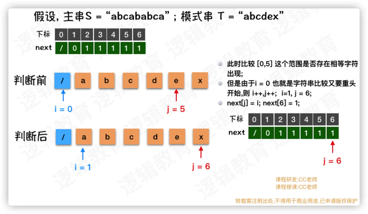 如上图,由于 T = "abcdex" 当中没有重复的数字, 所以 j 就由 6 变成了1;
