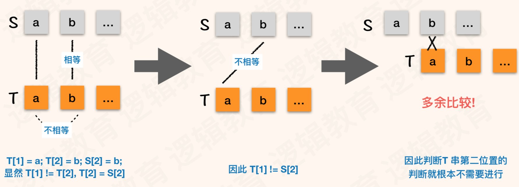 - 那么就意味着. T串中的首字符 "a" 与 S 串中的第二位 "b" 是不需要判断. 也知道他们不可能相等; 那么图②是可以省略的!