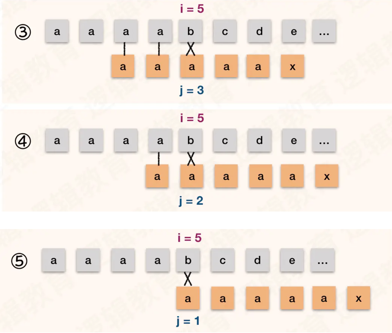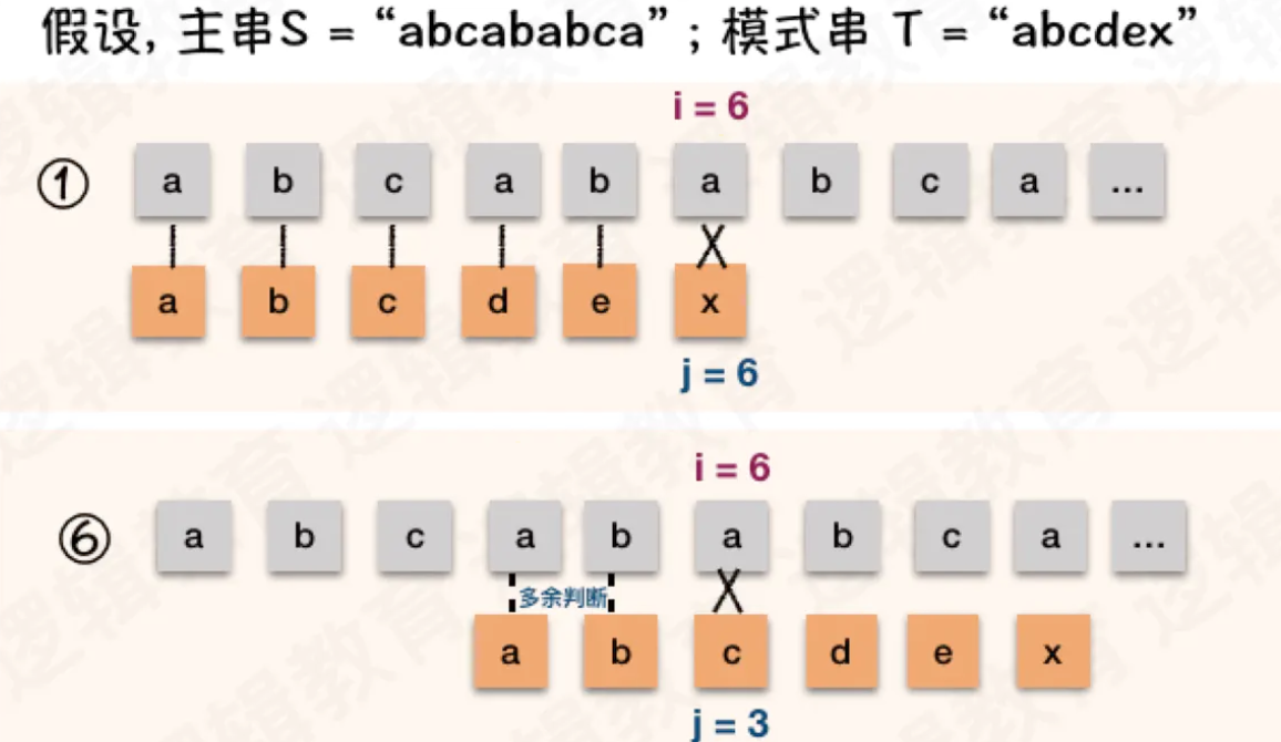 - 其实,在比较的过程发现 当中②③④⑤步骤的回溯比较都是多余的判断;