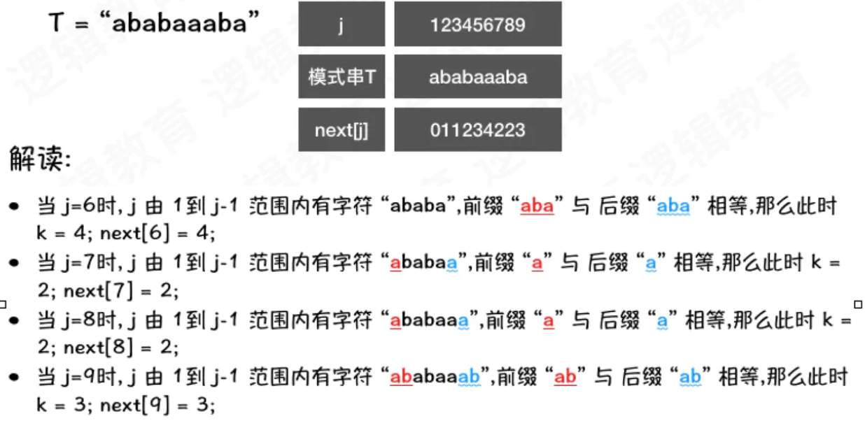 - 例如当j=6时,字符串"ababa", 最大前缀是"aba",后缀也是"aba".