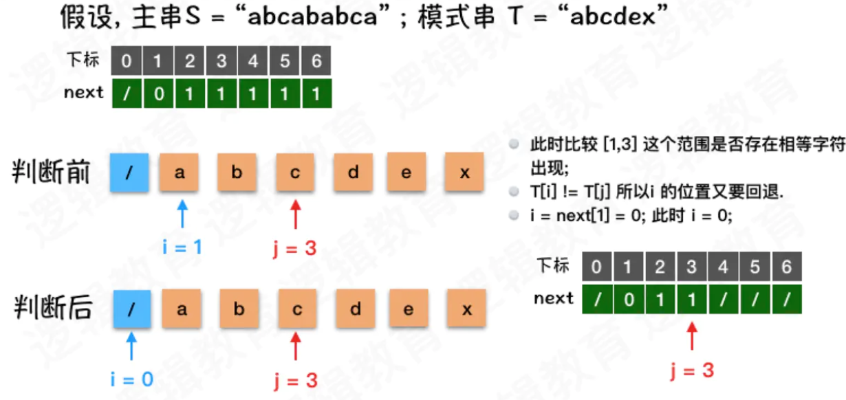 - 当 T[i] != T[j] 表示不相等,则需要将i 退回到合理的位置. 则 i = next[i];