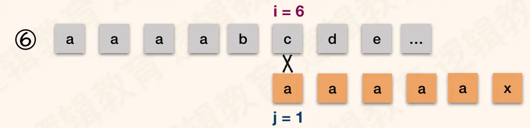 以此内推. 如图④⑤; 当 j = next[1] = 0时,根据算法,此时 i++,j++; 得到i = 6,j = 1. 如图⑥;