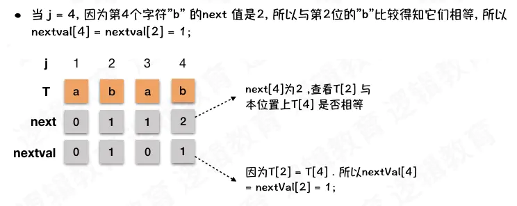 - 当 j = 2时, 也就是当j = 2发生匹配错误, 那么由于第二个字符'b'的 next 值是1, 而且第一个字符是'a' .两者不相等.所以nextval[2] = next[2] = 1;