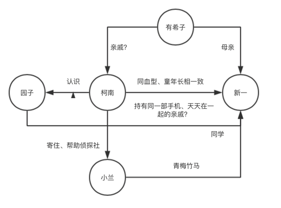 当我们完成边的定义后,人物关系得以清晰展示。我们可以尝试通过梳理剧情,逐步将人物关系入库。例如在96集《走投无路的名侦探 连续两大杀人事件》中,小兰帮熟睡中的柯南摘掉了眼镜,发现他的长相与小时候的新一一模一样,使得小兰不由怀疑起柯南的身份。当小兰把柯南领到新一家门口逼他招供时,新一妈妈有希子及时出现,帮柯南隐瞒了身份。有希子解释说:新一和柯南是亲戚啦,天天和新一在一起玩才会神态如此相像。由此我们可以定义出:有希子、柯南、新一为相互熟知的关系。