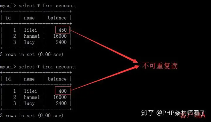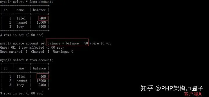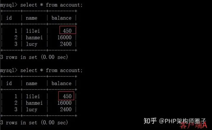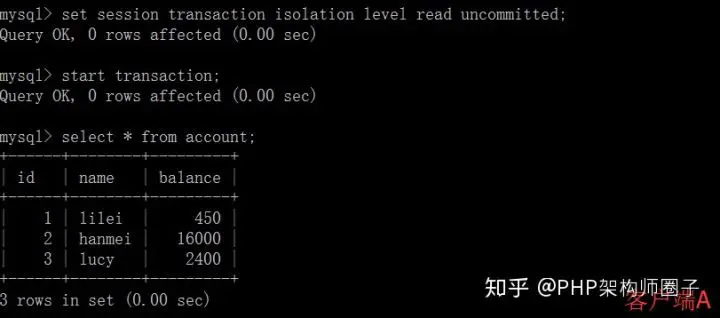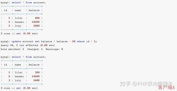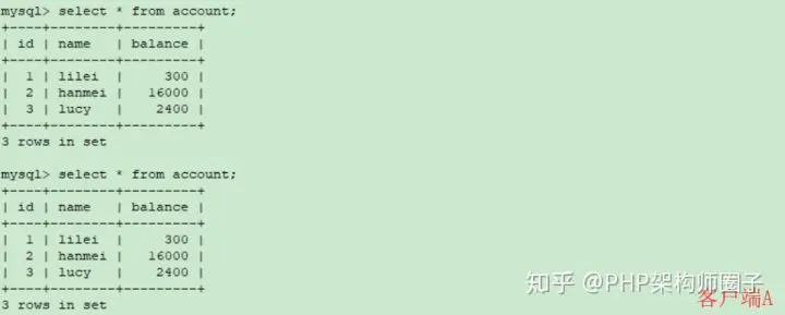③在客户端A查询表account的所有记录,与步骤(1)查询结果一致,没有出现不可重复读的问题