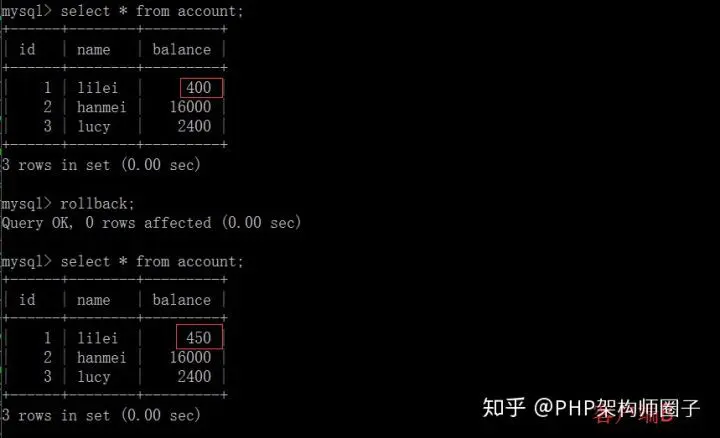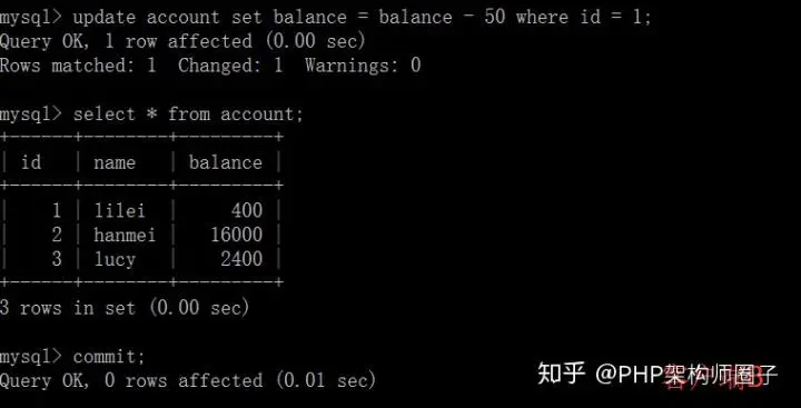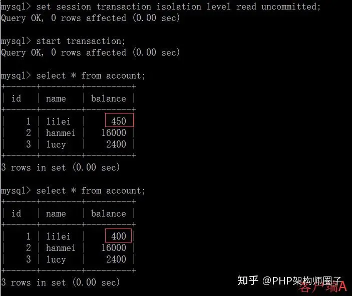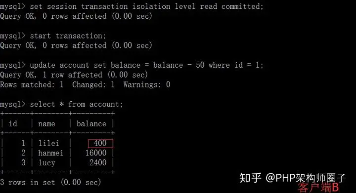 ⑤在客户端A执行更新语句update account set balance = balance - 50 where id =1,lilei的balance没有变成350,居然是400,是不是很奇怪,数据不一致啊,如果你这么想就太天真 了,在应用程序中,我们会用400-50=350,并不知道其他会话回滚了,要想解决这个问题可以采用读已提交的隔离级别。
