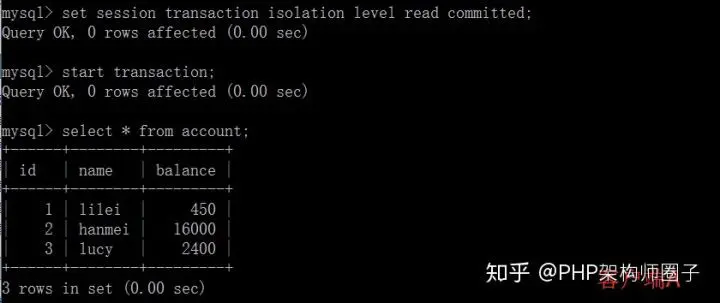 ①打开一个客户端A,并设置当前事务模式为read committed(未提交读),查询表account的所有记录: