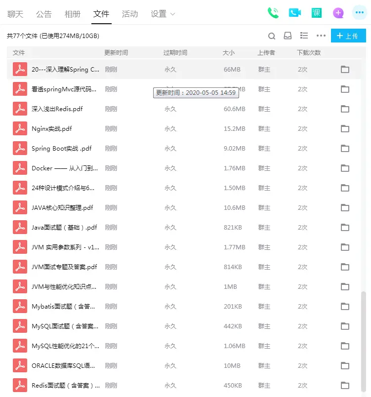 Jvm性能调优、Spring,MyBatis,Nginx源码分析,Redis,ActiveMQ、Mycat、Netty、Kafka、Mysql、Zookeeper、Tomcat、Docker、Dubbo、Nginx、简历模板等多个知识点高级进阶干货,希望看到这篇文章的人可以在2020年找到适合自己的工作,进入自己梦寐以求的公司。