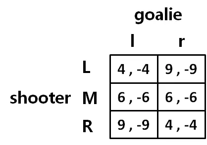 我们来看如下一个博弈。在点球大战中,博弈的双方分别是点球方和守门员。点球方有3种策略,分别是向左踢(L),向中间踢(M),向右踢(R)。而守门员就两种选择,向左扑(l),向右扑(r)。具体的博弈用表格展示如下: