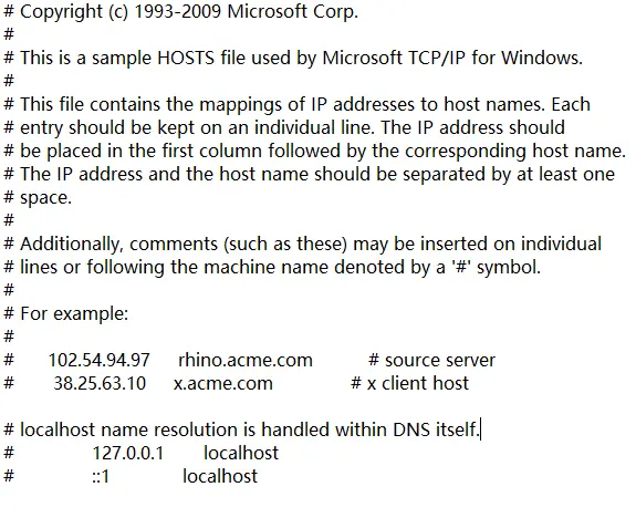 我们打开该文件,Window也有一些对该文件的介绍,大概就是说我们可以通过写入IP地址然后空格域名的方式指定该域名解析的IP地址,从而覆盖其真正的主机。有过一些后端基础的同学可能知道,为了方便我们经常将127.0.0.1为了方便从而替换成localhost,为的就是在访问本机网址的时候可以通过localhost的方式,写起来更简单一些。