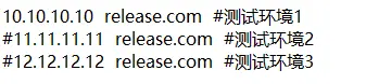 服务端首先需要将测试环境和正式环境分别部署在不同的电脑上,其次正式环境和测试环境的域名都保证是同一个,这两条在稍微正规一些的项目应该都是没问题的。接下来服务端只需要告知客户端所有测试服务端的ip地址,客户端同学将所有的ip都保存到hosts里面,在使用的时候相应地放开某些限制就可以了,做法如下图: