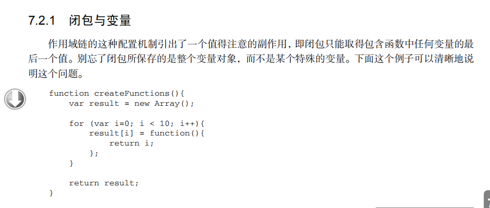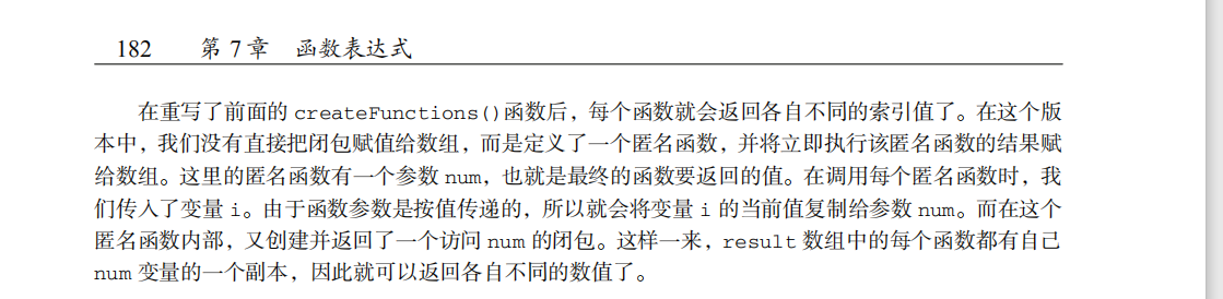 在匿名函数内部,又创建并返回了一个访问num的闭包,这样一来,rresult数组中的m每个函数都有z自己num变量的一个副本,因此就可以返回各自不同的数值了。