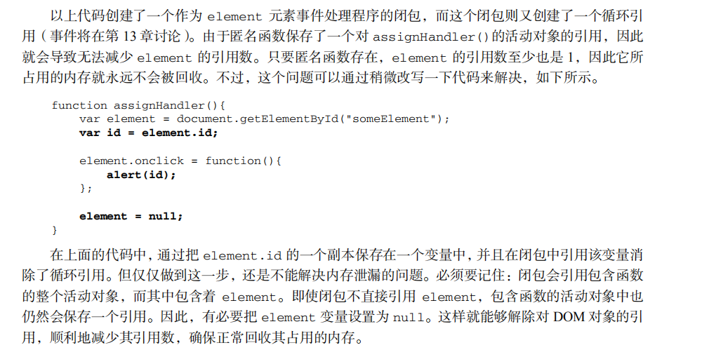 而其中包含着 element,即使闭包不直接引用element,包含函数的活动对象中也仍然会保存一个引用。