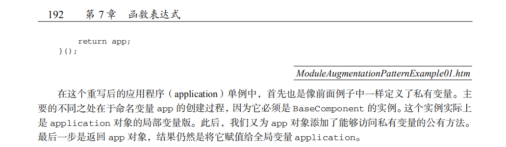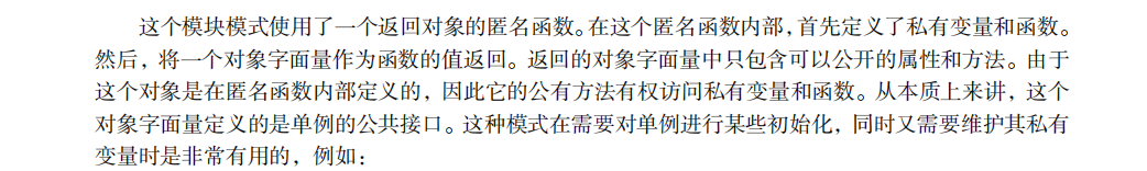 简言之,如果必须创建一个对象并以某些数据对其进行初始化,同时还要公开一些能够访问这些私有数据的方法,那么它就可以使用模块模式。