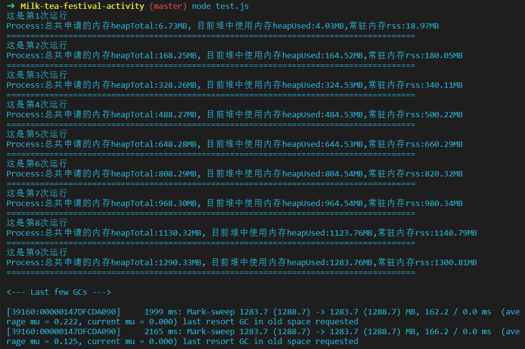 结果也是非常的amazing啊,运行不到10次内存就消耗完了。大家可以想象一下假如你的内存有泄露的显现是多么可怕,最终就会导致整个进程的退出了。这里我们可以清楚地看到,老生代的空间大概是1400MB左右,因为假如再执行一次就会超出范围了。