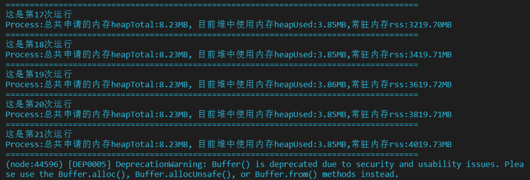 我们发现循环的21次都成功运行,而且我们看到常驻内存那里已经超过了V8的限制。这里的buffer对象是不受V8控制和分配的,属于堆外内存。