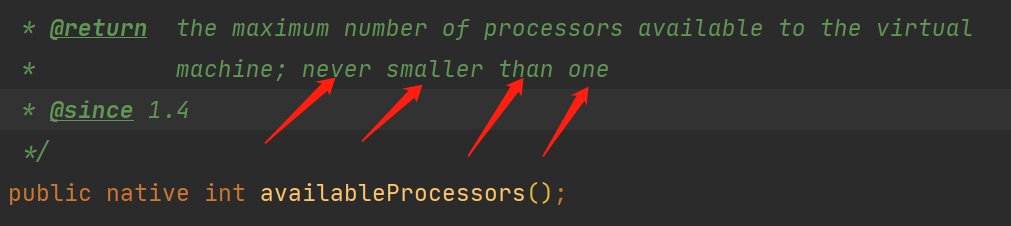 确实在创建线程池的时候有可能抛出 非法参数异常. 对比下这几条异常条件 corePoolSize < 0 不满足,默认线程池大小为 3 , keepAliveTime < 0 不满足,这里为30秒. 那么剩下的只有 maximumPoolSize <= 0 和 maximumPoolSize < corePoolSize 这两个了. Runtime.getRuntime().availableProcessors()点进去瞅一眼,是个native方法,返回值永远 ,那么