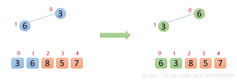 插入6的时候,6大于他的父节点3,即arr(1) > arr(0),则交换,此时,保证了0~1位置是最大堆,如图所示: