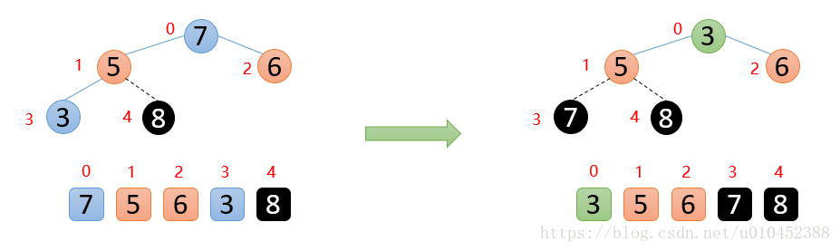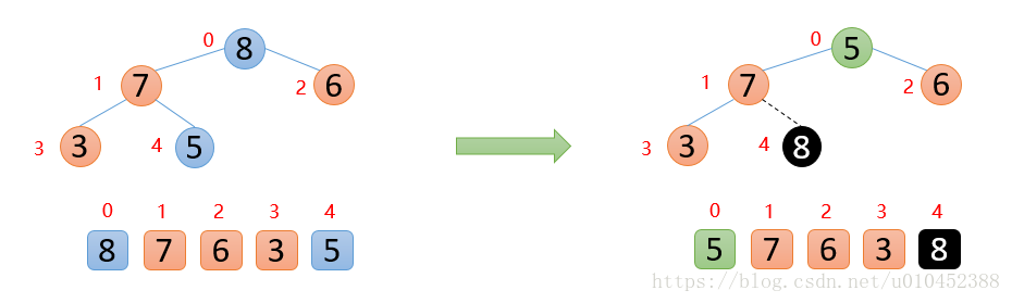 3.将剩余的n-1个数再构造成最大堆,再将顶端数与n-1位置的数交换,如此反复执行,便能得到有序数组