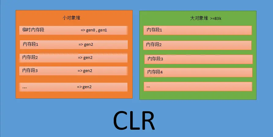 当CLR不小心错入程序世界的时候,会给你分配两个堆,一个叫做小对象堆,一个叫做大对象堆,默认是以83k作为大小堆的分界线,当然你也可以自定义配置,堆上的空间由很多的内存段拼成的,可能你有点蒙,我画张图吧。