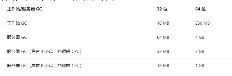 这个段的大小,需要看是x64还是x86机器,还要看GC是工作站模式还是服务器模式,不过msdn帮我们总结了,docs.microsoft.com/zh-cn/dotne… , 截个图给大家看一下。