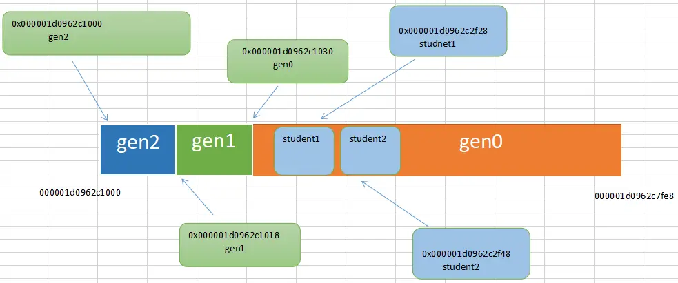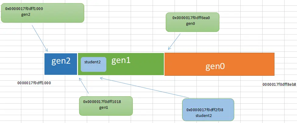 仔细看上面的输出,从主线程的堆栈上可以看到student1和studnet2的地址依次为0x000001d0962c2f28, 0x000001d0962c2f48,而gen0的起始地址为:0x000001d0962c1030,刚好落在 gen0 的区间内,可能你有点蒙,我画一张图。