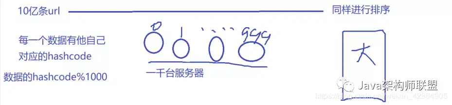 同样的,如果我现在有1000台服务器进行10亿条url的排序工作,我是不是可以将这10亿条url的hashcode%1000.然后每一台服务器只去处理自己对应的数据就可以,每一台服务器上的小文件都是有序的,然后就可以进行最后的合并工作