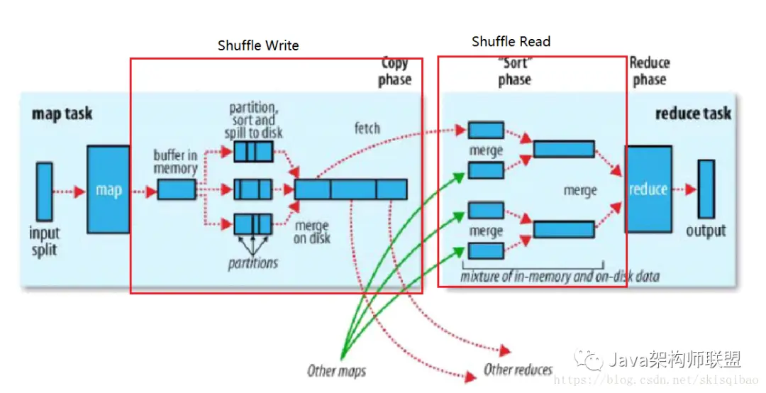 最消耗资源最影响效率是在磁盘上进行的---也就是shuffle过程