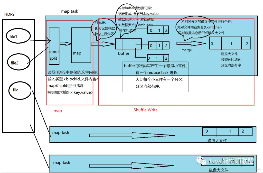 所有溢写完毕后, 会将磁盘小文件合并成一个大文件, 合并时先对数据进行聚合(Combiner), 然后再使用归并算法将各个小文件合并(merge)成一个根据分区号划分且内部有序的大文件. 每一个map task都会产生这么一个大文件