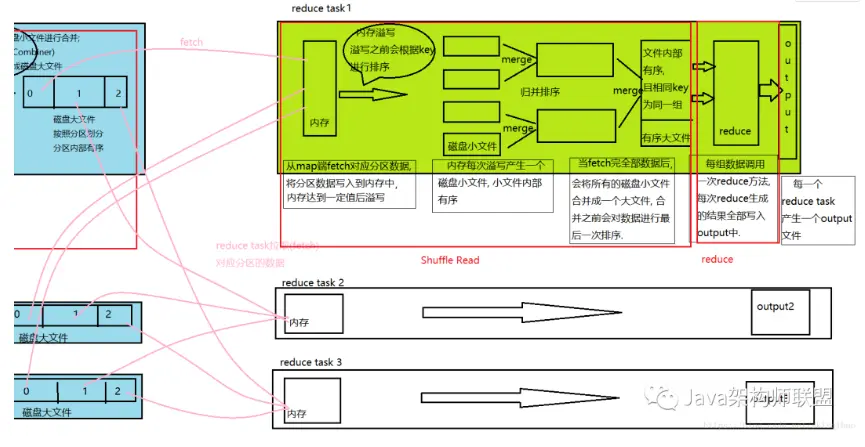 reduce会 去map端拉取数据(shuffle),他会把磁盈上的数据拉取到reduce自己的内存中(默认1G)
