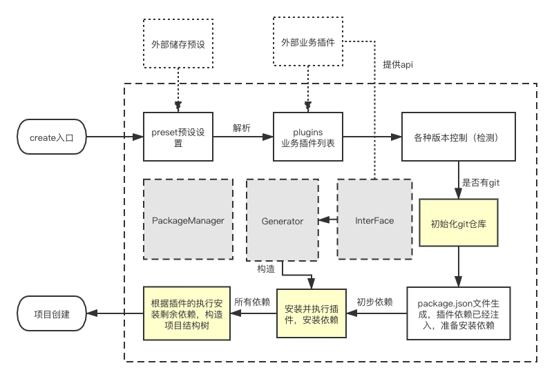 所以我们一步步来,大体的项目目录如上图所示,通过预设解析的Plugins(业务插件),通过版本控制,git仓库初始化,初始化项目结构,在项目树的package.json依赖树里面注入插件提供的dep,通过Generator构造器执行插件内部的逻辑,生成所有的依赖,从而构造出了项目结构。